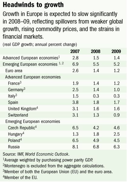Financial market strains, spillovers from the U.S. slowdown, and the global reassessment of risks will adversely affect Europe in 2008, the IMF's latest Regional Economic Outlook (REO) says.