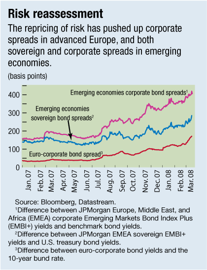 Moreover, in advanced Europe, counterparty confidence remains disrupted in the interbank markets, and liquidity considerably impaired, despite central banks' heavy intervention. Everywhere, the global repricing of risk has pushed up spreads in different asset classes (see chart). Financing costs have increased, and credit standards have been tightened.