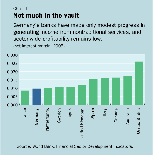 As a result of deep-rooted fragmentation, interest margins remain low by international standards, and Germany's banking sector has made only modest progress in generating income from nontraditional services (see Chart 1). Sector-wide profitability remains low and banks, therefore, may be inclined to take on excessive risks.