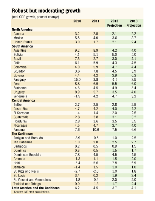 The IMF’s Regional Economic Outlook for the Western Hemisphere, released on April 25, projects growth in Latin America at 3¾ percent in 2012, before returning to about 4 percent in 2013.
