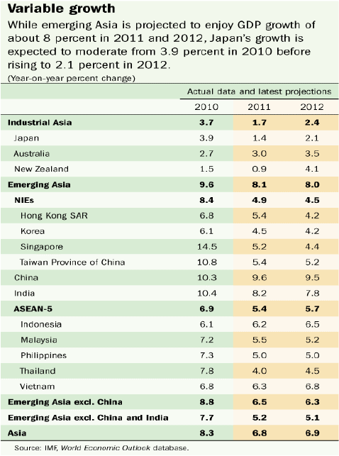 After reaching a rate of 8.3 percent in 2010, GDP growth in Asia is projected to average nearly 7 percent in both 2011 and 2012, according to the IMF.