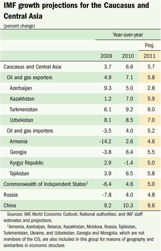 In 2011, as oil and gas production growth slows, the region’s expansion is expected to moderate to 5¾ percent, IMF Middle East and Central Asia Department Deputy Director David Owen told reporters at an April 28 press briefing on the report in Tbilisi, Georgia.