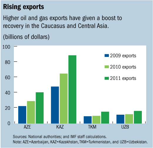 In 2010, the region’s oil and gas exporters (Azerbaijan, Kazakhstan, Turkmenistan, and Uzbekistan) experienced 7 percent growth and improved their current account position by 5½ percentage points of GDP. Although the expansion was lower—at 4 percent—in oil and gas importing countries (Armenia, Georgia, the Kyrgyz Republic and Tajikistan), these countries’ external positions also strengthened, aided by higher mineral and metal prices. Foreign exchange reserves generally increased, particularly in Azerbaijan and Kazakhstan, where there was also a significant accumulation of assets in sovereign wealth funds, the report says.