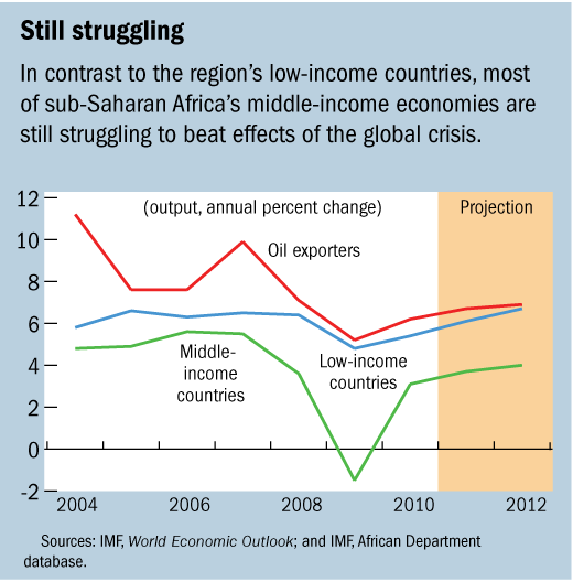 In contrast to the buoyant low-income countries, most medium-income countries are still struggling to overcome dislocations caused by the global financial crisis (see chart). Within the Southern African Customs Union, recovery from the downturn has generally been at a slower pace than elsewhere in sub-Saharan Africa.