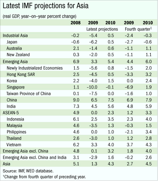 Overall, the IMF expects growth for Asia to decelerate to 1.3 percent in 2009 from 5.1 percent in 2008, and to return to 4.2 percent—still below potential—in 2010.