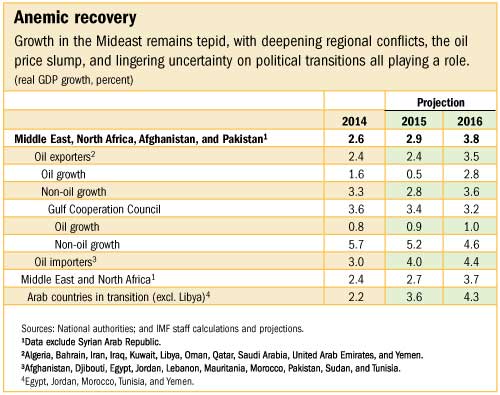 According to the IMF, growth in the region’s oil-exporting countries reached about 2½ percent in 2014 and is expected to remain at this level in 2015. Next year, growth is projected to rise to 3½ percent, but this forecast is predicated on the assumption that security conditions will stabilize and oil production will recover in oil exporters outside the Gulf Cooperation Council.