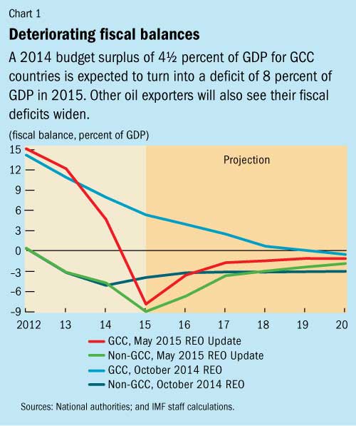 The budgets of oil-exporting countries are also severely affected by the oil price slump, with fiscal balances deteriorating to an average deficit of 8½ percent of GDP (see Chart 1). A sharp rise in spending in recent years has made budgets vulnerable to lower oil prices, Ahmed noted. “Most countries in the region cannot balance their budgets when oil prices approach $60 a barrel,” he said.