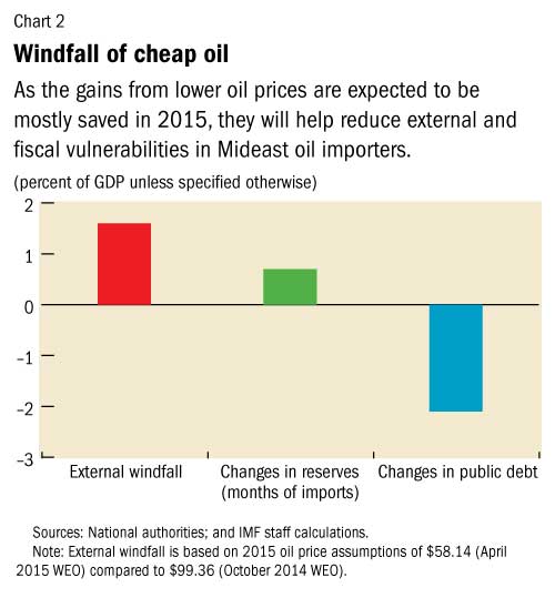 As a group, the oil importers will likely see their growth rate increase to about 4 percent this year from about 3 percent in 2014, Ahmed said. Countries have chosen for the most part to save the gains from lower oil prices, which has helped them reduce public debt and increase international reserves (see Chart 2). Signs of confidence—such as stock market gains and a pickup in credit growth—are emerging.