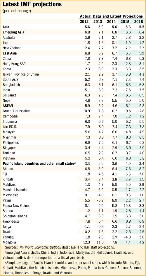 Growth in Asia and the Pacific will continue to outperform the rest of the world, and is expected to remain steady at 5.6 percent in 2015, easing slightly to 5.5 percent in 2016, according to the IMF’s Regional Economic Outlook for Asia and the Pacific.
