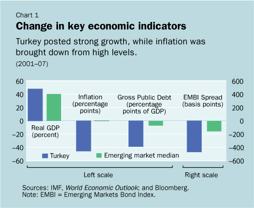 Thanks to good policies and a benign external environment, Turkey has experienced six years of strong and stable economic performance, including in comparison to its emerging market peers (see Chart 1).