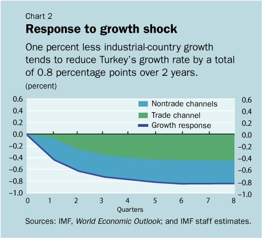 Near-term prospects are further clouded by the expected slowdown in global economic activity: IMF staff research suggests that a 1 percentage point reduction in industrial-country growth tends to reduce Turkey's growth by a cumulative 0.8 percentage points over two years (see Chart 2). Under current conditions, however, this impact should be mitigated somewhat by the continued dynamism of other emerging markets, whose share in Turkey's total exports has risen from 20 percent to 26 percent over the past three years alone.