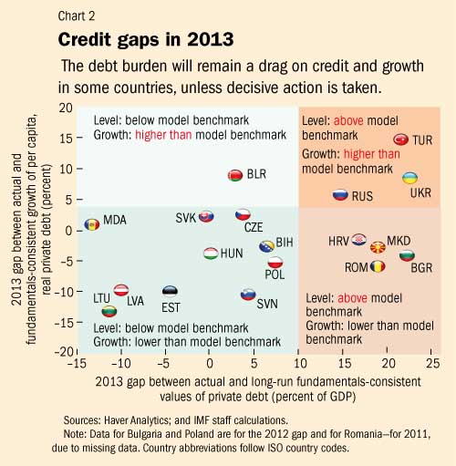 Projections of the credit gap into the medium-term suggest that the debt burden will remain a drag on credit and growth in some countries, unless decisive action is taken. This is particularly true for Bulgaria, Croatia, and Ukraine.