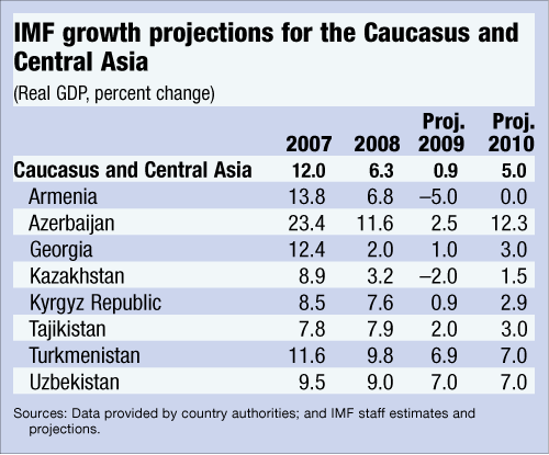Growth in the Caucasus and Central Asia (CCA) is expected to come to a near halt this year—contracting to 0.9 percent in 2009 from 6.3 percent in 2008—and recover only gradually in 2010, according to the latest IMF forecast for the region.