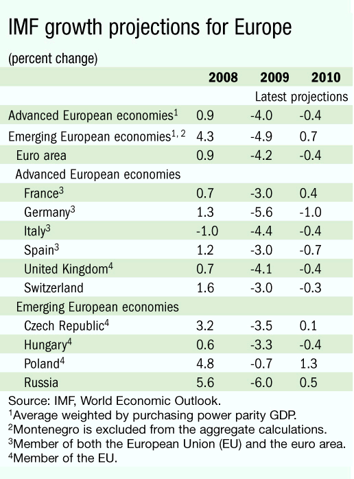 In advanced Europe, output growth is projected to contract sharply by 4.0 percent in 2009 and decline slightly in 2010. Output in emerging markets is projected to fall by 4.9 percent in 2009, with a modest recovery projected for 2010. Establishing a solid economic recovery will require stronger policy action that is effectively coordinated at the European level, the IMF says in its latest assessment of conditions in the region.