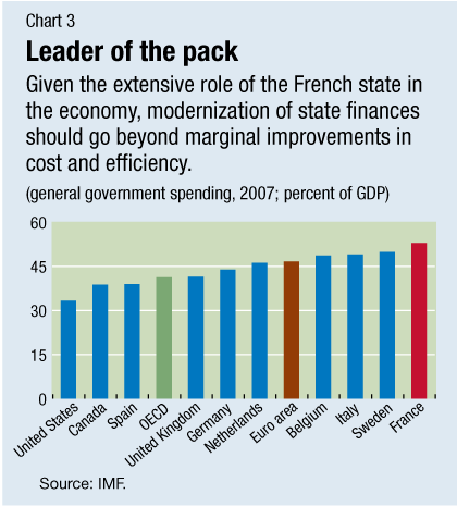 The comprehensive review of public policy, initiated last year, has already identified areas where public expenditure can be reduced and public services improved. Given the extensive role of the French state in the economy, the exercise should go beyond marginal improvements in costs and efficiency to rationalize public functions and refocus on core missions, thus achieving meaningful and lasting reductions in expenditure (see Chart 3).