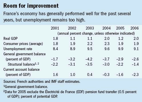 France has already implemented important reforms. The central government's budget framework has been put on a performance-based footing, making the public sector potentially much more efficient. Between 2004 and 2006, the structural fiscal deficit was halved. The new labor market contract adopted in 2005 represented a breakthrough in labor market reform. And product market and administrative deregulation have made France much more attractive to business.
