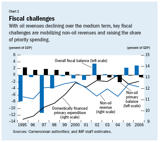 Managing the "fiscal space." Although Cameroon's overall budgetary position has strengthened over the past two years, the underlying fiscal situation is less favorable. Aided by large oil revenue inflows and improved budget management, the overall fiscal balance has been in surplus. But the non-oil primary balance has deteriorated over the past decade because domestically financed primary spending has expanded faster than non-oil revenues, partly reflecting an increase in debt relief-financed priority outlays (see Chart 2). The fiscal space provided through debt relief should therefore be used prudently. How can Cameroon achieve that?