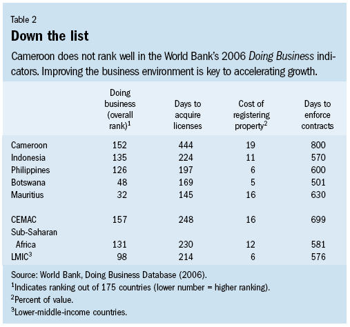 Improving the business environment. Accelerating growth would also require considerable improvement in the business environment. Available indicators of the investment climate show that Cameroon does not do well in contract enforcement, timely issuance of licenses, and cost of registering property (see Table 2).