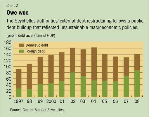 In mid-April 2009, Paris Club creditors granted exceptional debt treatment to Seychelles under the 2003 Evian approach to debt relief, reducing the debt stock by 45 percent in nominal terms in two tranches, with the remainder rescheduled over 18 years with 5 years’ grace. Comparable treatment from other creditors is needed to close financing gaps over the medium term and secure public debt sustainability.