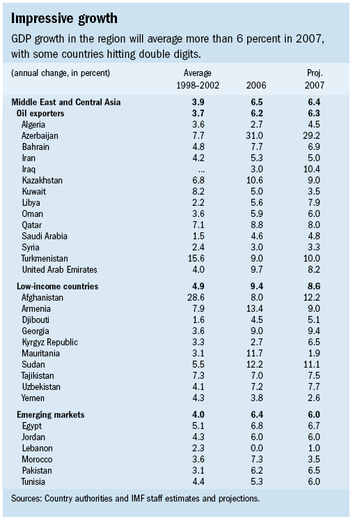 The briefing, by Mohsin Khan, Director of the IMF department responsible for the region, marked the release of the May 2007 Regional Economic Outlook: Middle East and Central Asia. Robust global growth, a favorable international financial environment, continued high prices for oil and other commodities, and sound policies in many countries are underpinning this strong growth. Real GDP growth is expected to remain strong at more than 6 percent on average, with double-digit growth projected in the Caucasus and Central Asian countries (see table).
