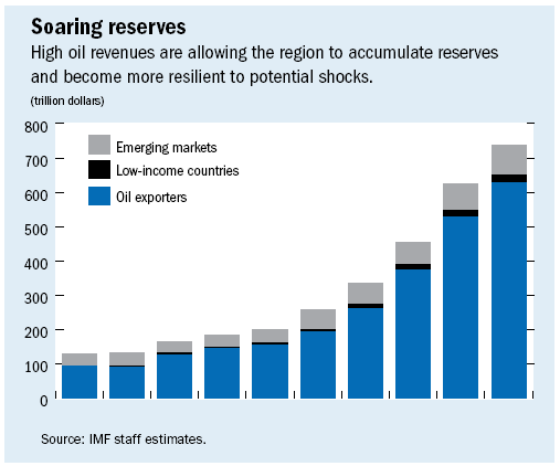 On a positive note, as the countries in this region increase their international reserves (see chart) and reduce their debt, they are becoming more resilient to potential shocks. Khan said that the region's key policy challenge is to sustain or even accelerate growth to make significant inroads into reducing poverty and unemployment. "