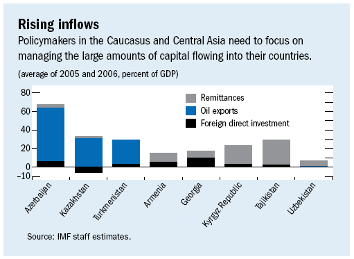 These countries are also grappling with some of the same issues of how to control inflation and manage the exchange rate. An April 25 seminar in Almaty, Kazakhstan, organized by the IMF's Middle East and Central Asia Department and co-sponsored by the National Bank of Kazakhstan, focused on policy options that would maximize the benefits of the inflows to the countries while maintaining external competitiveness and keeping inflation under control.