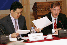 National Bank of Kazakhstan Chairman Anvar Saidenov (l) with Willy Kiekens, IMF Executive Director for Kazakhstan's country group (photo: IMF staff).