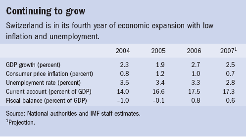 Switzerland's medium-term prospects also appear bright. Growth in 2007 is projected to be about 2½ percent, with continued gains in employment and inflation of less than 1 percent.