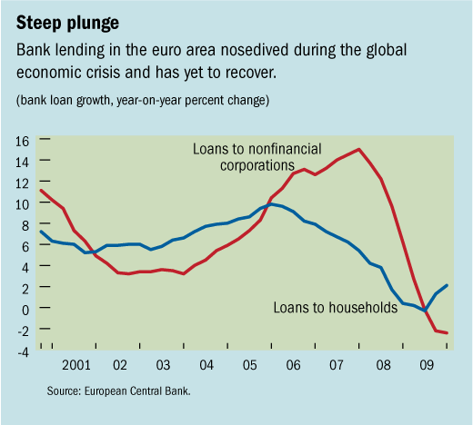 A well-functioning financial system will be crucial to strengthening the moderate and uneven recovery that is currently under way in the euro area. But continued worries about public finances may impact the financial system adversely, the IMF warns in its report. In turn, problems in the financial system threaten the real economy. They make life especially difficult for the small and medium-sized enterprises, which depend on a sound banking system to continue to create jobs and deliver the majority of goods and services to households (see Chart 1).