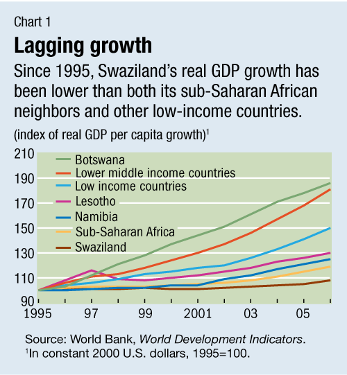 Swaziland's real per capita GDP growth declined from an annual rate of 2 ½ percent during 1980-94 to 0.7 percent since then (see Chart 1). In contrast, real growth in all of sub-Saharan Africa has averaged 1 ½ percent annually since 1995 and in other lower-middle-income countries, growth averaged 7 ½ percent.