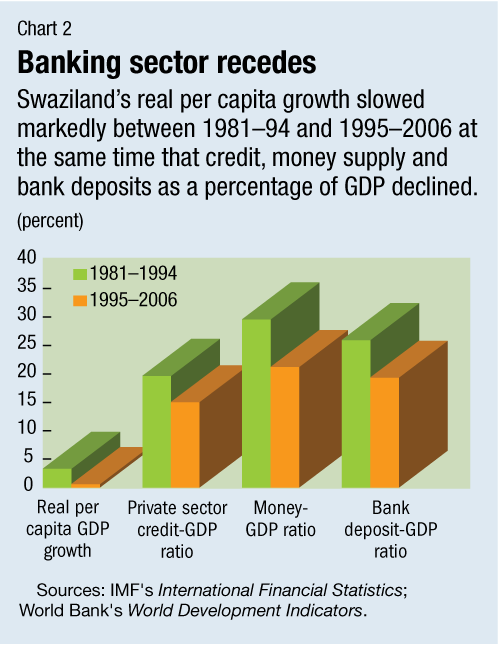 The slow growth may have worsened already difficult conditions in the tiny, landlocked country where in 2001, the latest year for which there are data, about two-thirds of its 1 million residents lived in poverty and 20 percent of the population claimed two-thirds of the income. A major contributor to the stagnating Swazi economy has been its financial sector, which, while in the main healthy, has taken steps backward in the past decade.