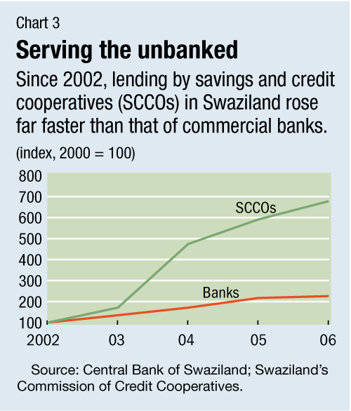 • The financial sector has become more vulnerable as a result of inadequate regulation and supervision of nonbank financial institutions (NBFIs), especially the savings and credit cooperatives (SCCOs) that have sprung up to fill the financial needs of the many Swazis abandoned by the commercial banking sector. Since 2002, lending by SCCOs has grown 116 percent, compared with 26 percent for banks (see Chart 3). Among the NBFIs, pension funds and insurance companies are generally sound, but some SCCOs face severe financial difficulties that could undermine confidence in the financial sector and limit SCCOs' recent gains in access to finance.