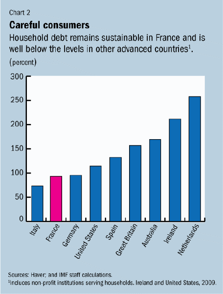 •Household debt is moderate. Despite an increase in household debts in recent years, household debt remains sustainable in France and is well below the levels in other advanced countries (see Chart 2).
