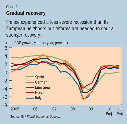 The IMF projects the French economy will grow by 1.4 percent in 2010 and 1.6 percent in 2011. While the recovery would be somewhat faster than in the euro area as a whole (see Chart 1), persistently high unemployment and imminent fiscal consolidation in France and its main trading partners will weigh on demand, despite some relief from the recent depreciation of the euro.