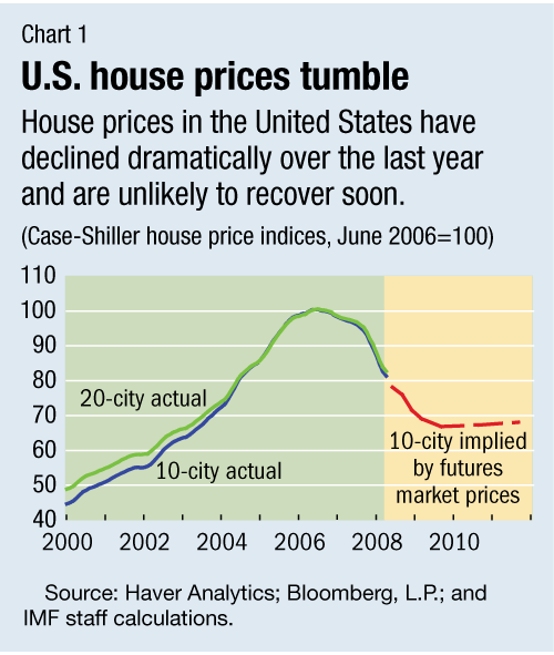 The unusual nature of the ongoing crisis in the financial and housing sectors leaves the outlook highly uncertain. The outlook crucially hinges on the evolution of house prices (see Chart 1), and the dynamic interaction of the financial sector and housing cycles.