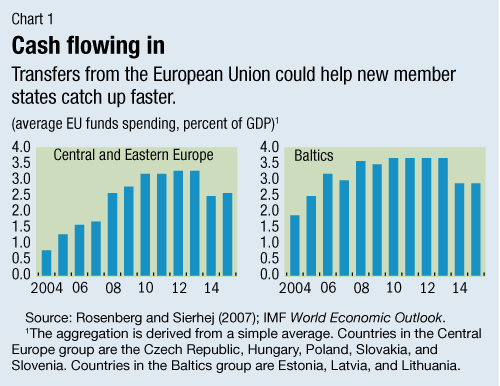 The EU's cohesion policy provides the basis for substantial transfers to member countries lagging in GDP per capita or facing particularly high unemployment. For the new member states in Central and Eastern Europe and in the Baltics, transfers amounting to as much as 3-4 percent of GDP are poised to flow in annually during 2008-15 (see Chart 1).
