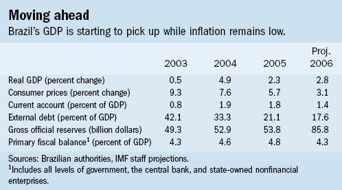 Economic growth, which has long been anemic, is beginning to pick up. Inflation continues to be low. Consumer prices rose only 3 percent between January 2006 and January 2007 and inflation expectations remain low. Brazil's external position is solid, with a strong current account surplus—1½ percent of GDP last year—and international reserves around $95 billion, equivalent to about 170 percent of its short-term debt.