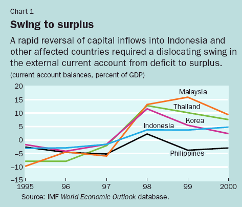 The 1997-98 regional financial crisis had a devastating impact on Indonesia. In common with the other affected countries, a rapid reversal of capital inflows required a dislocating swing in the external current account from deficit to surplus (see Chart 1).