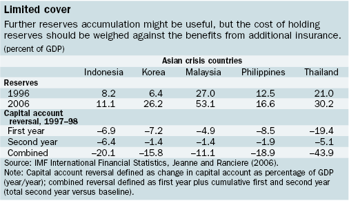 Certainly, the current level of reserves—equivalent to around 11 percent of GDP—is still limited compared with the capital account reversal experienced in 1997-98 (see table). While this suggests some further reserves accumulation might be useful, the substantial cost of holding reserves needs to be weighed against the benefits from additional insurance.