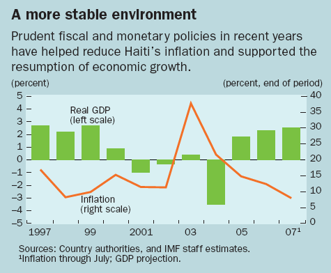 At the conclusion of the 2007 Article IV consultations last July, the IMF's Executive Board considered that Haiti's short- and medium-term economic prospects are encouraging. Real GDP growth would probably reach about 3 percent this fiscal year—the third consecutive year of positive growth—and accelerate to 4 percent in the medium term, as infrastructure constraints and other bottlenecks are expected to be gradually removed. The further development of the monetary policy framework should contribute to consolidating a stable low-inflation environment.