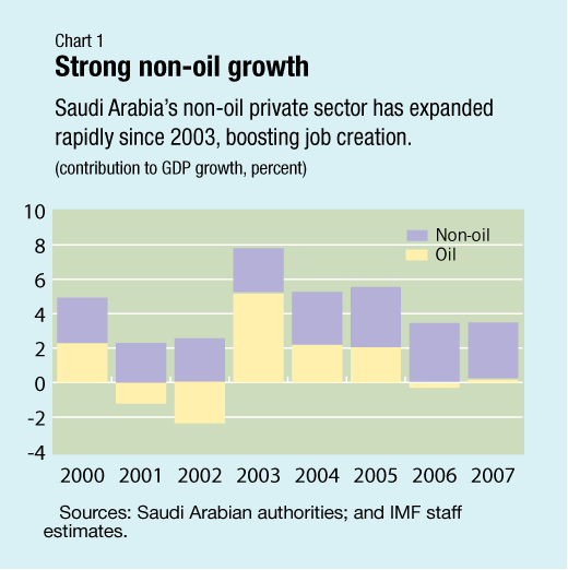 Non-oil private growth has averaged 5.4 percent during 2003-07 (see Chart 1), leading to substantial job creation, including for foreign workers mainly from low-income countries in the region and Asia, who sent home $16 billion in remittances in 2007. However, unemployment among the young remains high, reflecting skill mismatches and high reservation wages.