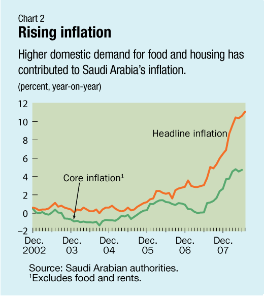 Domestic demand pressures arising from higher income and wealth, supply constraints (housing), and imported inflation (food) have been the main factors. Given the peg to the dollar, Saudi Arabia was also importing the easing monetary stance of the United States since mid-2007, further fueling inflation.