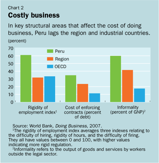 Boosting long-term growth prospects. Peru lags in critical structural areas that constrain growth and induce elevated levels of informality (see Chart 2). While recent World Bank Doing Business indicators show some progress, significant gains can still be made in such areas as labor market flexibility and contract enforceability.