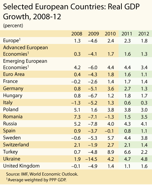 Emerging Europe is now caught up in the downturn of advanced countries. Economic performance held up well in the first half of 2011, especially in the largest economies of the region, Poland, Russia, and Turkey. Encouragingly, growth picked up impressively in the Baltics and, to a lesser extent, in Southeastern Europe, all countries where the 2008/09 crisis had hit hard.