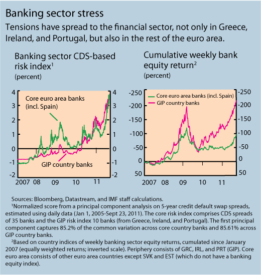 But Europe also contributed to the slowdown with home-grown difficulties from escalating tensions in the euro area’s sovereign debt and financial markets. Sovereign spreads widened sharply in the program countries Greece, Ireland, and Portugal, and tensions spread to Italy and Spain and more broadly through the entire financial system (see chart). While emerging Europe continues to do relatively well, it too could be affected, given its close financial and economic links with the west.
