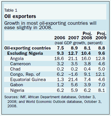 In oil exporters, growth is expected to fall temporarily by half a percentage point, to 8 percent in 2008, reflecting mainly lower-than-expected oil output in the Niger Delta due to recurring violence there; slightly lower-than-expected production in Equatorial Guinea's maturing main oil field; and weaker non-oil growth in Chad. In oil importers, growth is also projected to decelerate, by half a percentage point, to 5 percent.