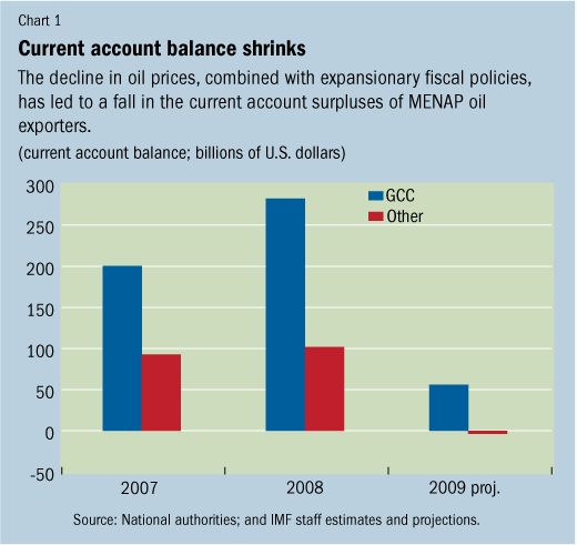 With the large drop in oil prices—from a peak of more than $120 per barrel in the summer of 2008 to around $30 per barrel at the beginning of 2009—and subsequent cuts in oil production, oil exporters (particularly the GCC) were hard hit.