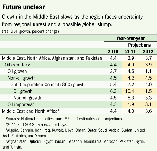 The IMF’s Regional Economic Outlook for the Middle East and Central Asia, released October 26, projects growth in the Middle East and North Africa region at 3.9 percent in 2011, down from 4.4 percent in 2010.