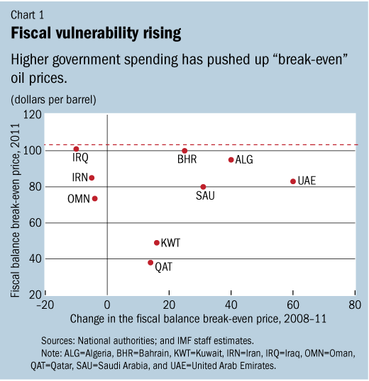 Fiscal vulnerability has also increased, however, as break-even oil prices—the prices at which the fiscal balance is zero given the level of expenditure and non-oil revenues—have risen steadily and are now approaching observed oil prices (see Chart 1).