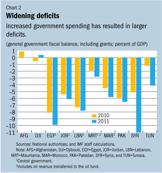 In response to growing social unrest, the economic downturn, and higher commodity prices, governments in the region have significantly expanded subsidies and transfers The cost of this social spending is high, exceeding 10 percent of GDP in Egypt and more than 5 percent of GDP in most other countries. As a result, oil importers’ fiscal deficits are widening by an average of about 1.5 percent of GDP to –7.6 percent of GDP in 2011 (see Chart 2).